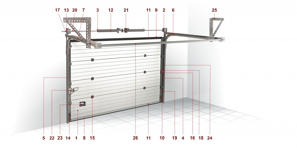 Соединение между секциями (панелями, профилями)подвижное – собственно, благодаря этому и возможен их подъем. В закрытом виде секционные ворота обладают большой жесткостью – сталь профилей не боится ударов, а концевые профили надежно закрепляются с помощью специальных приспособлений.